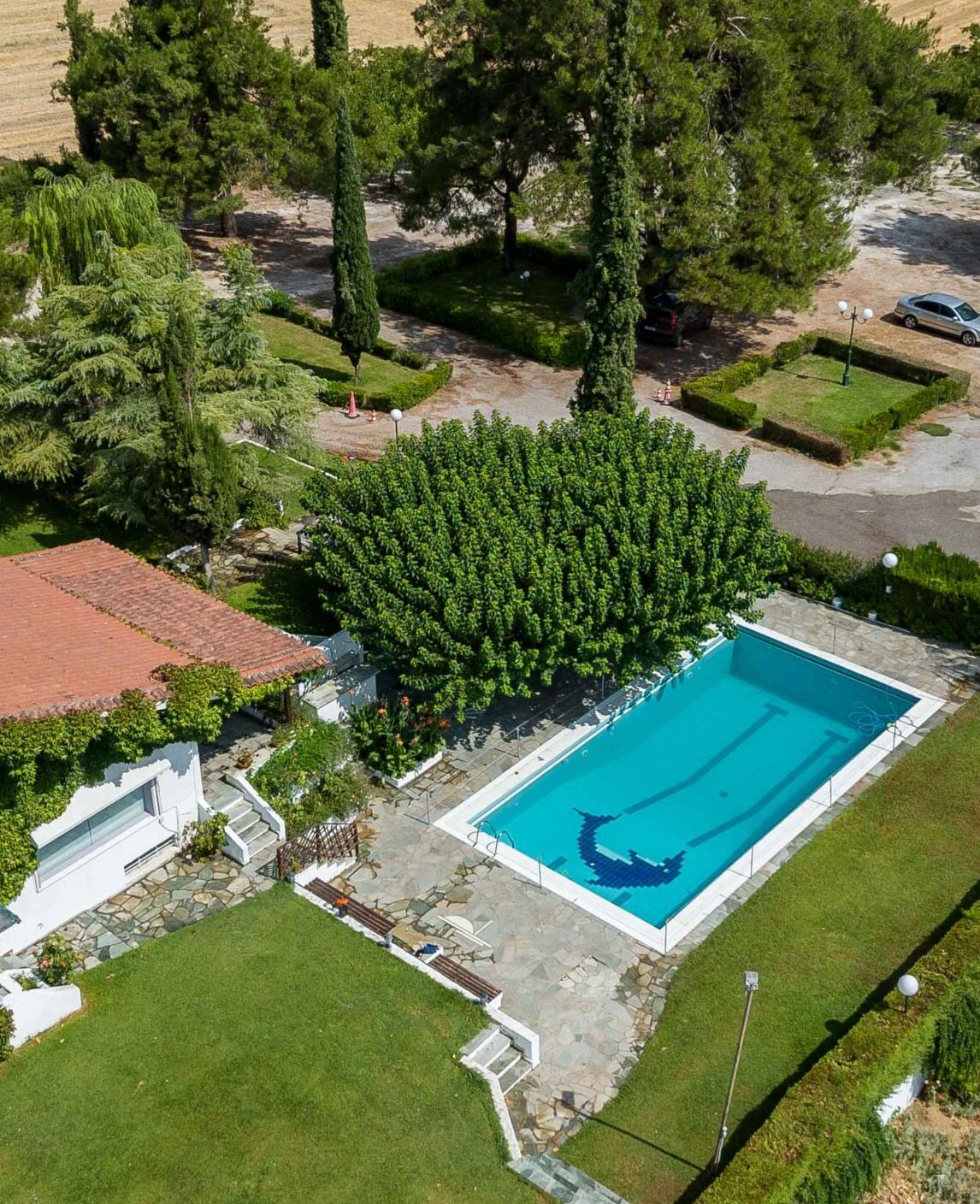 The villa is ideally located in the estate of 7000 sq.m., so that you can enjoy the well-kept gardens, the swimming pool in front and the view from every point of the house.